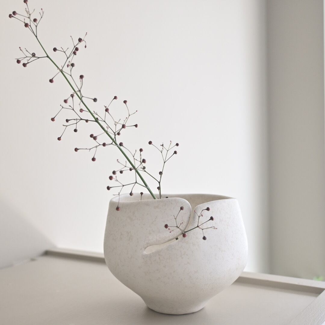 シンプルでありながら存在感のあるフォルム、そして機能を超えた美しさ。こんな作品に出会えると、どんな花を生けようか、どう飾ろうかと想像が膨らんで心が躍ります。