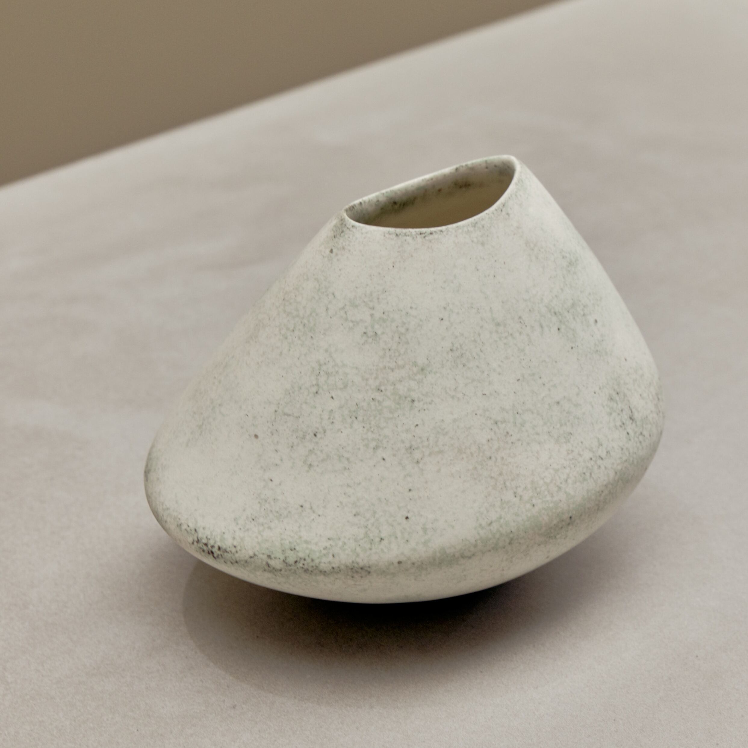 片山亜紀 Aki Katayama 色層とは色味を加えた土を何層か重ねた独自の粉引です。淡いグリーンが溶け込んだやさしい色あい。様々なタイプのお花に対応する細い楕円の口が特徴的な花器です。 約W14.5×D12cm×H10cm 口径 約5.5×2.5cm