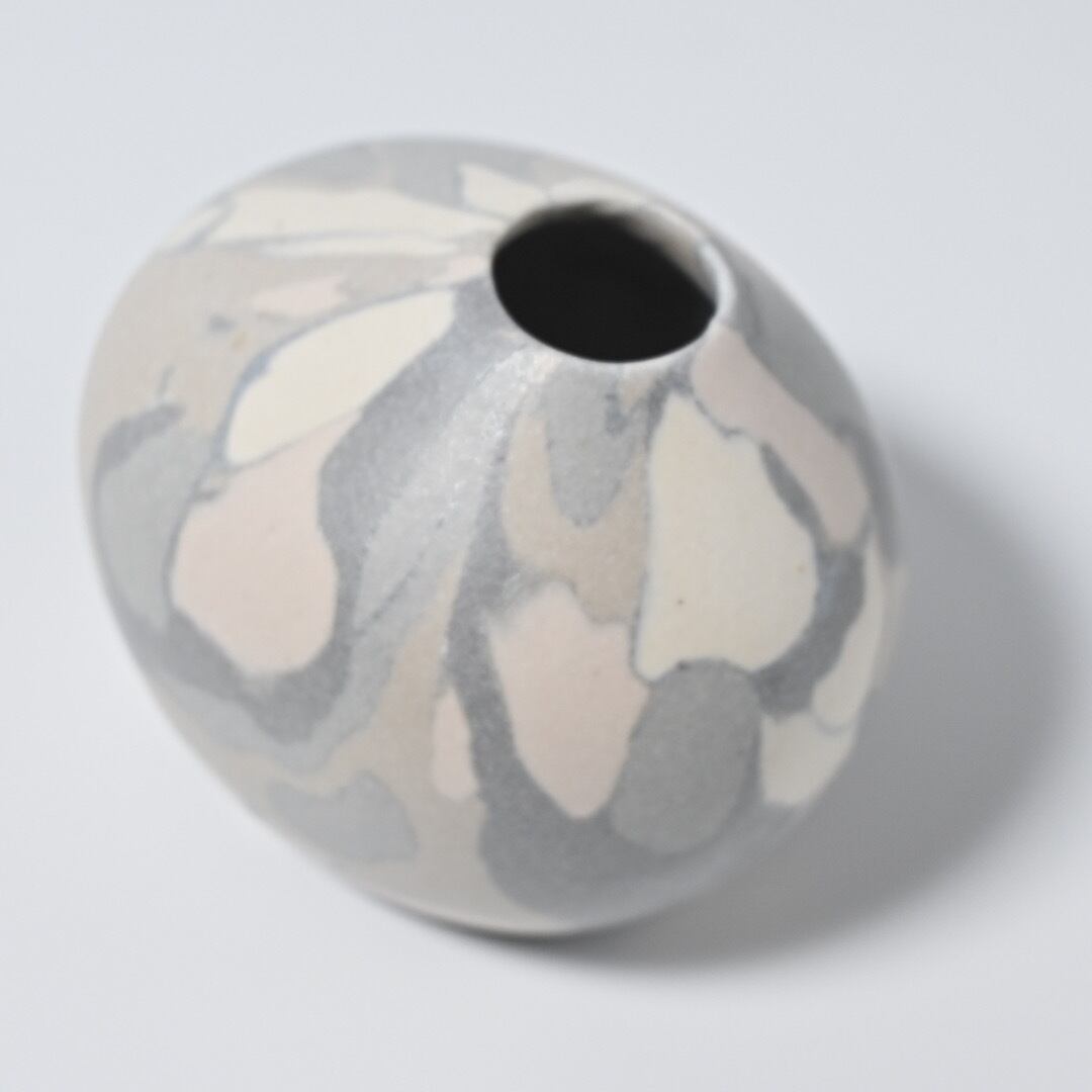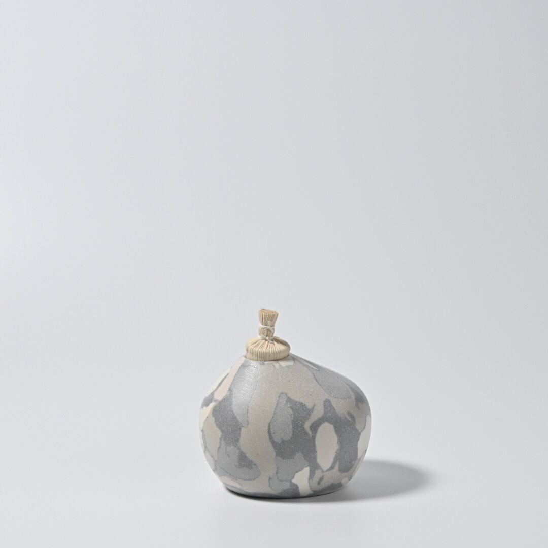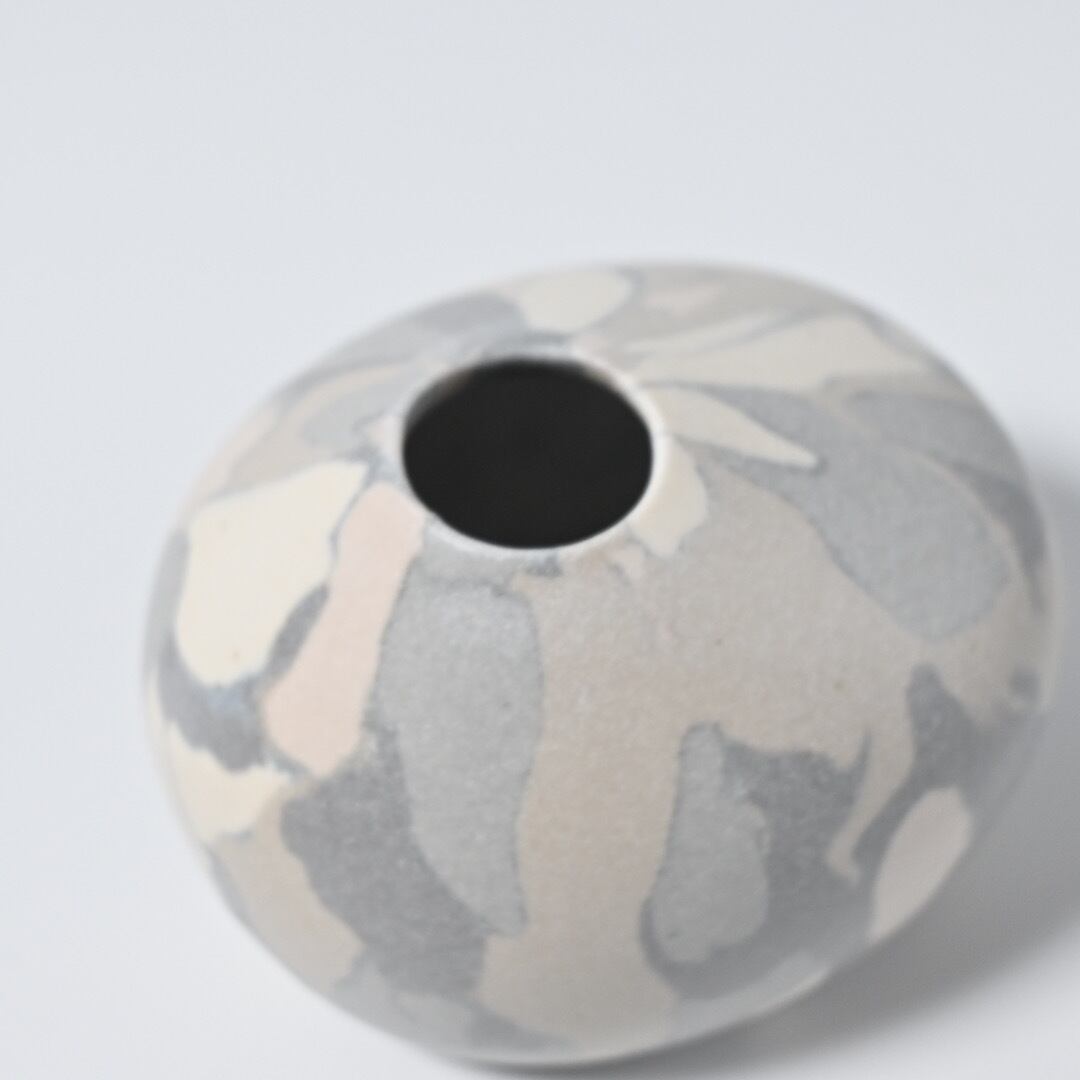 柔らかな風合いのモザイク模様は、土の粒をランダムに並べて少しづつお団子状にした塊からできています。手間を惜しまない丁寧なお仕事です。本来の用途は茶道具のひとつで金平糖や、砂糖豆など小粒な歌詞を入れる菓子器となっていますが、スゲ蓋を外して一輪挿しにもしていただけます。小さなものなのでさりげなく飾っておくのも心が和むアイテムです。