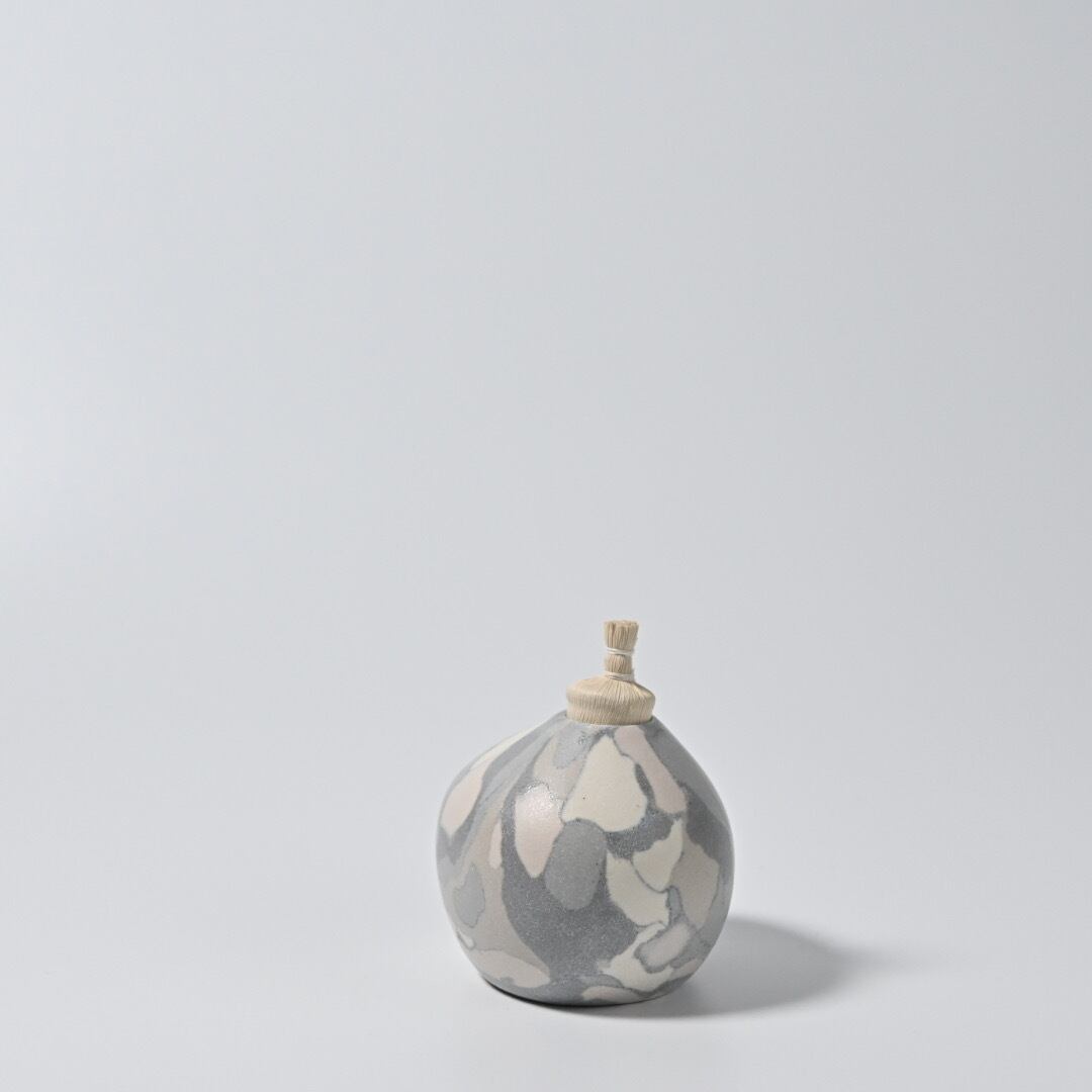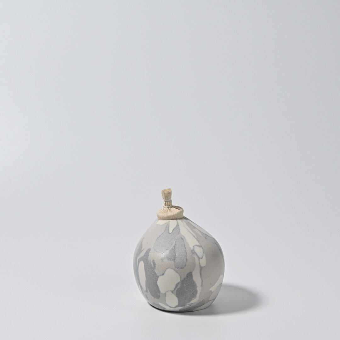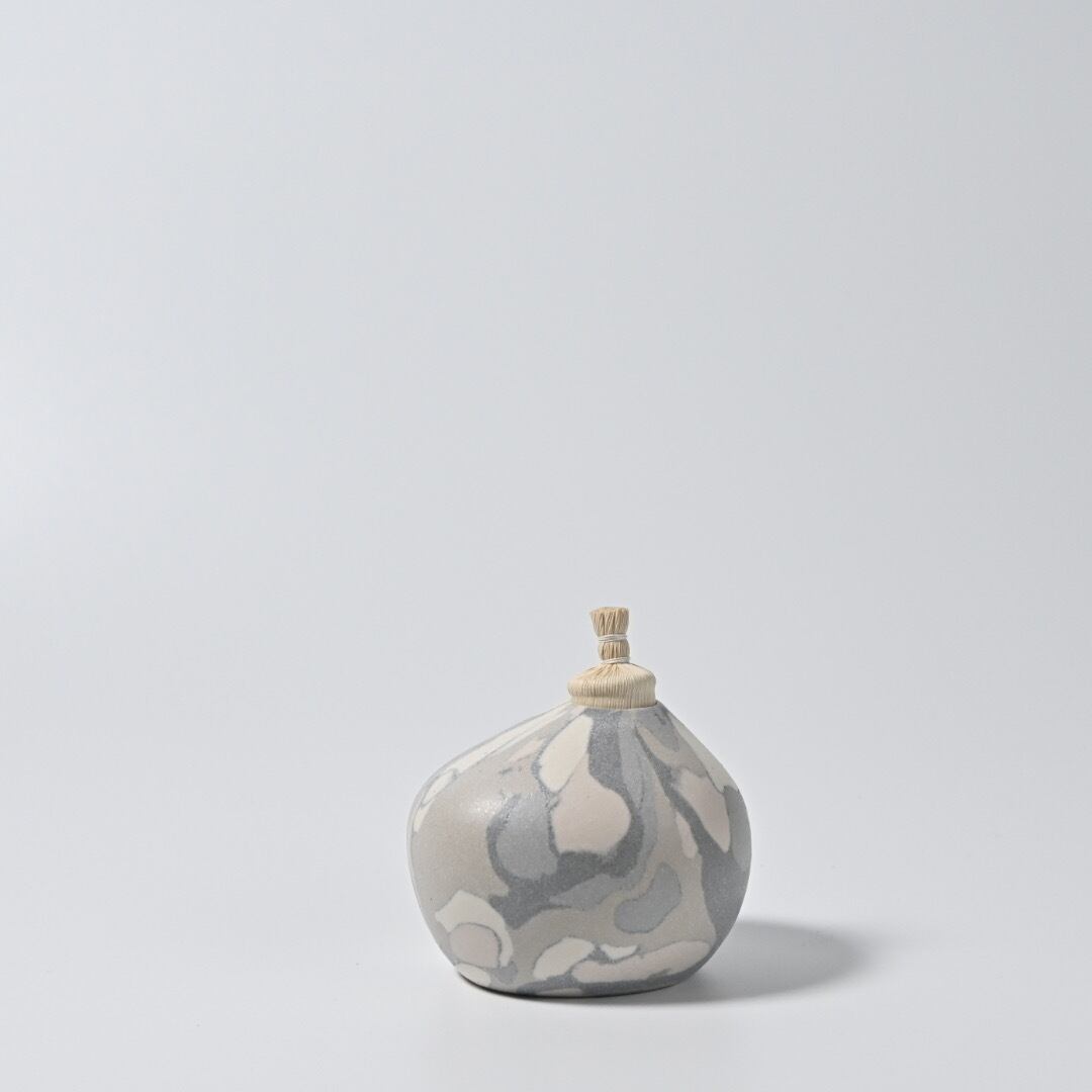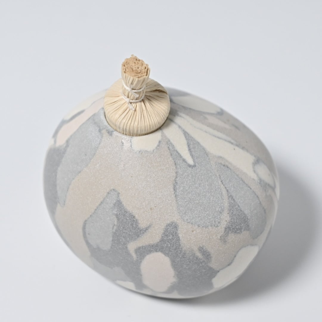 柔らかな風合いのモザイク模様は、土の粒をランダムに並べて少しづつお団子状にした塊からできています。手間を惜しまない丁寧なお仕事です。本来の用途は茶道具のひとつで金平糖や、砂糖豆など小粒な歌詞を入れる菓子器となっていますが、スゲ蓋を外して一輪挿しにもしていただけます。小さなものなのでさりげなく飾っておくのも心が和むアイテムです。