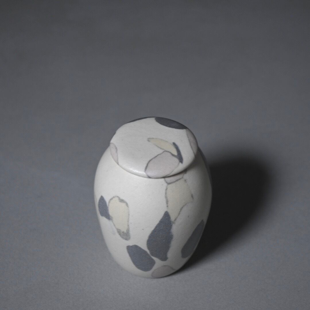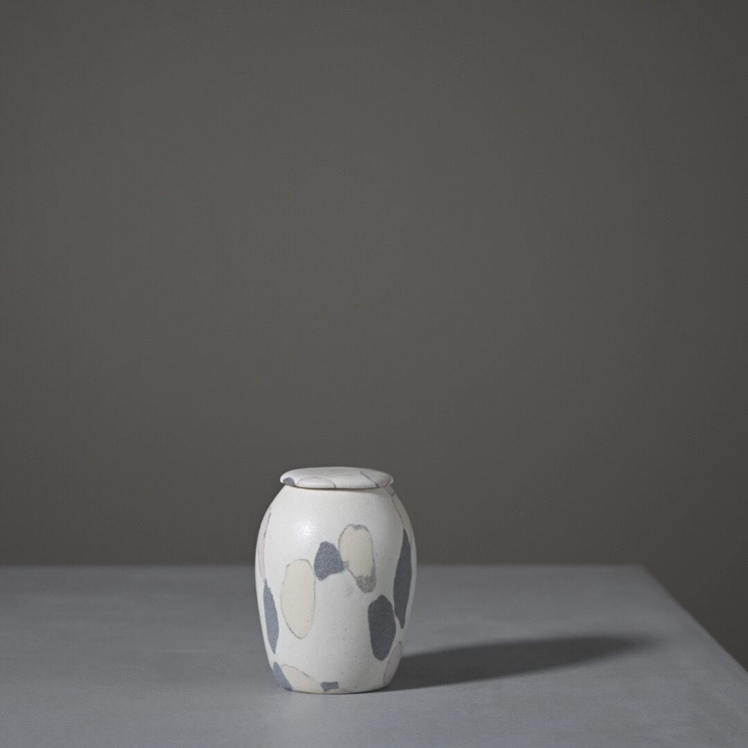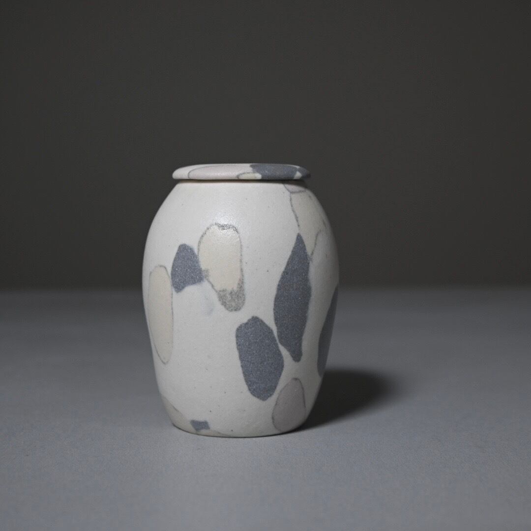 柔らかな風合いのモザイク模様は、土の粒をランダムに並べて少しづつお団子状にした塊からできています。手間を惜しまない丁寧なお仕事です。本来の用途は茶道具の茶入れですが、掌におさまるやさしい肌合いは、大切にしておきたい何かをおさめておくのにもおすすめします。