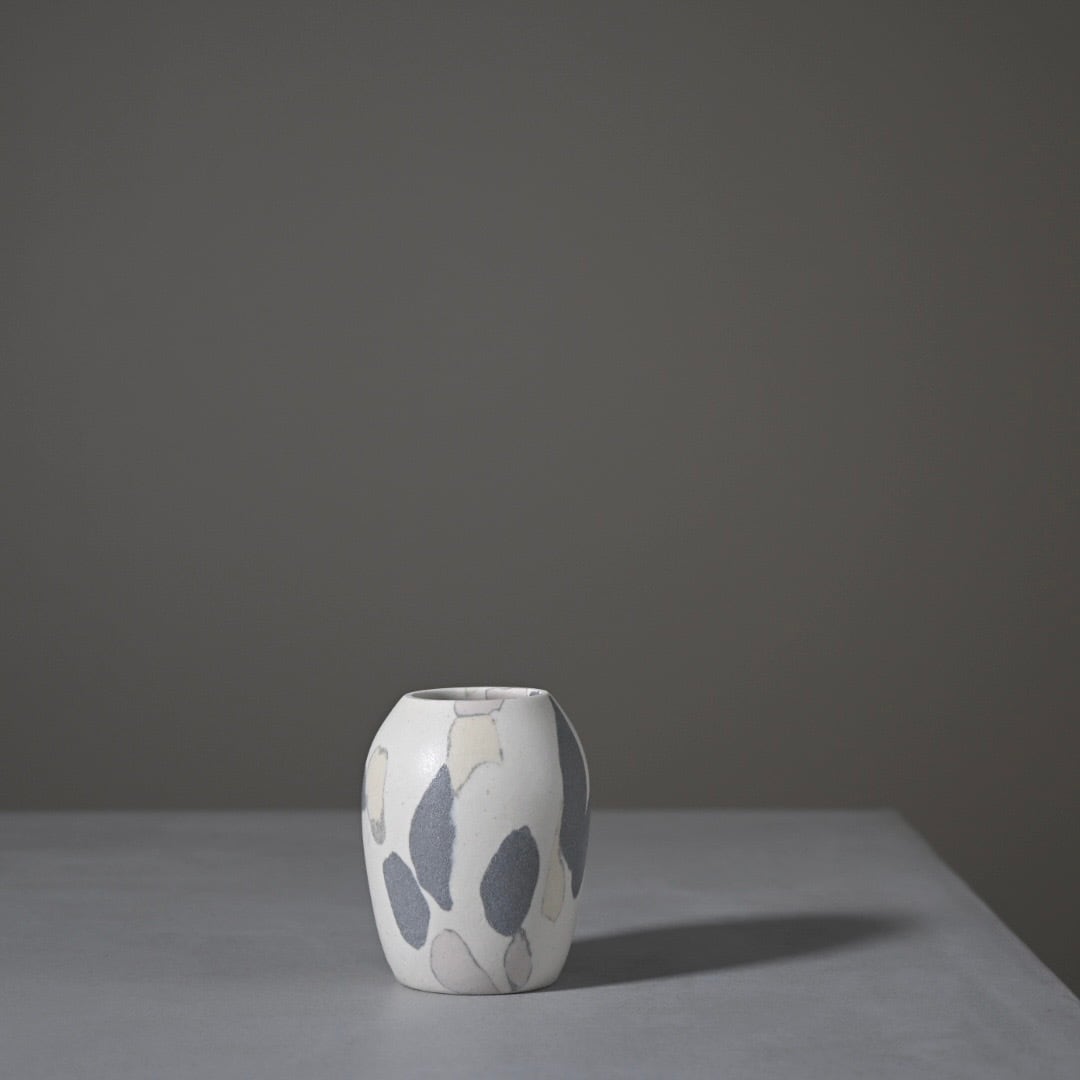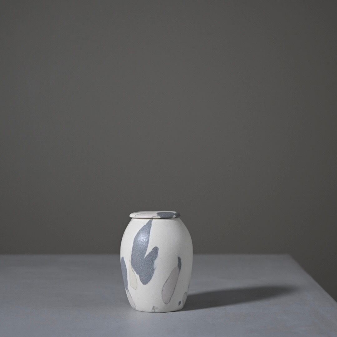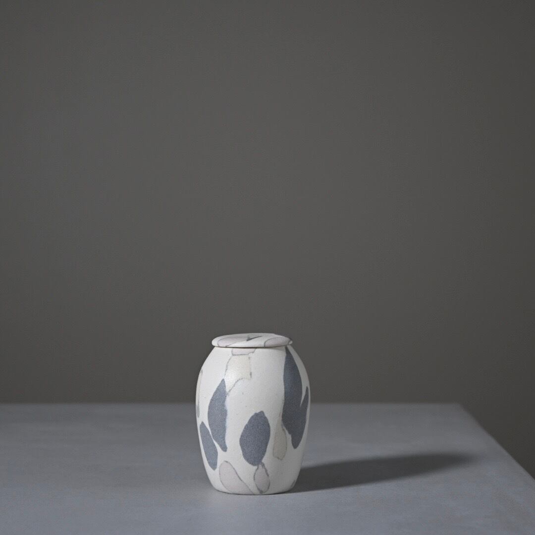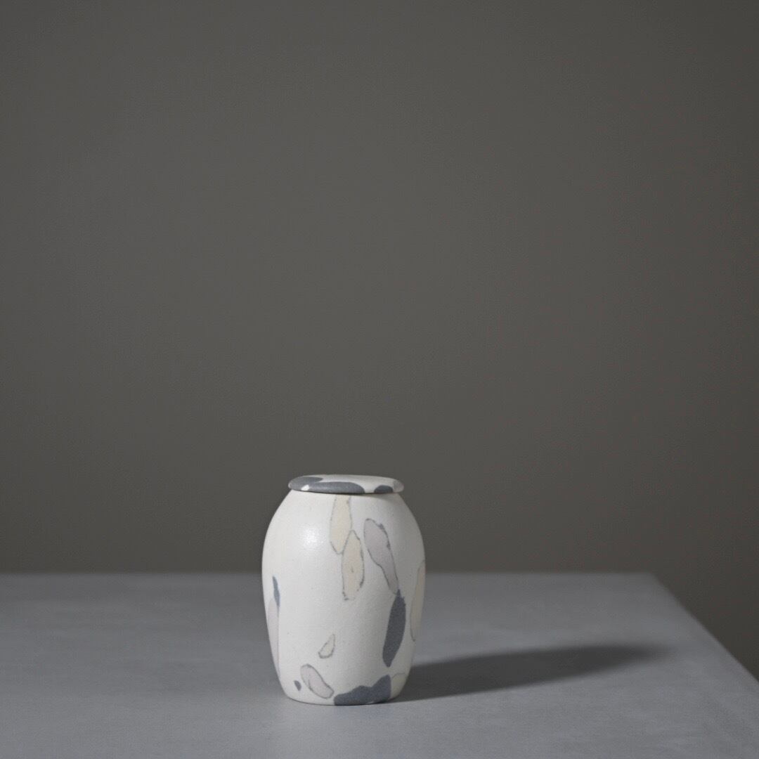 柔らかな風合いのモザイク模様は、土の粒をランダムに並べて少しづつお団子状にした塊からできています。手間を惜しまない丁寧なお仕事です。本来の用途は茶道具の茶入れですが、掌におさまるやさしい肌合いは、大切にしておきたい何かをおさめておくのにもおすすめします。