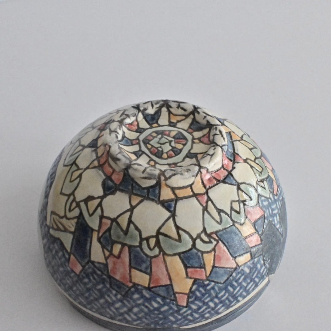 下絵で彩色した後、全体に釉薬を施し焼き上げた作品。装飾のモチーフは実際に見たり感じたことを写真家のように一瞬のワンショットを捉えるような感覚で作品に落とし込まれているそう。
