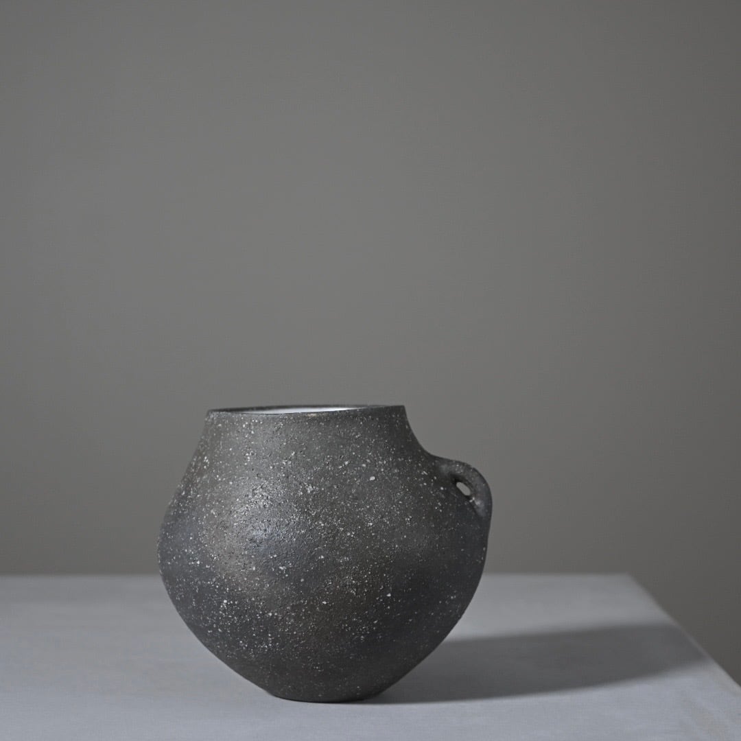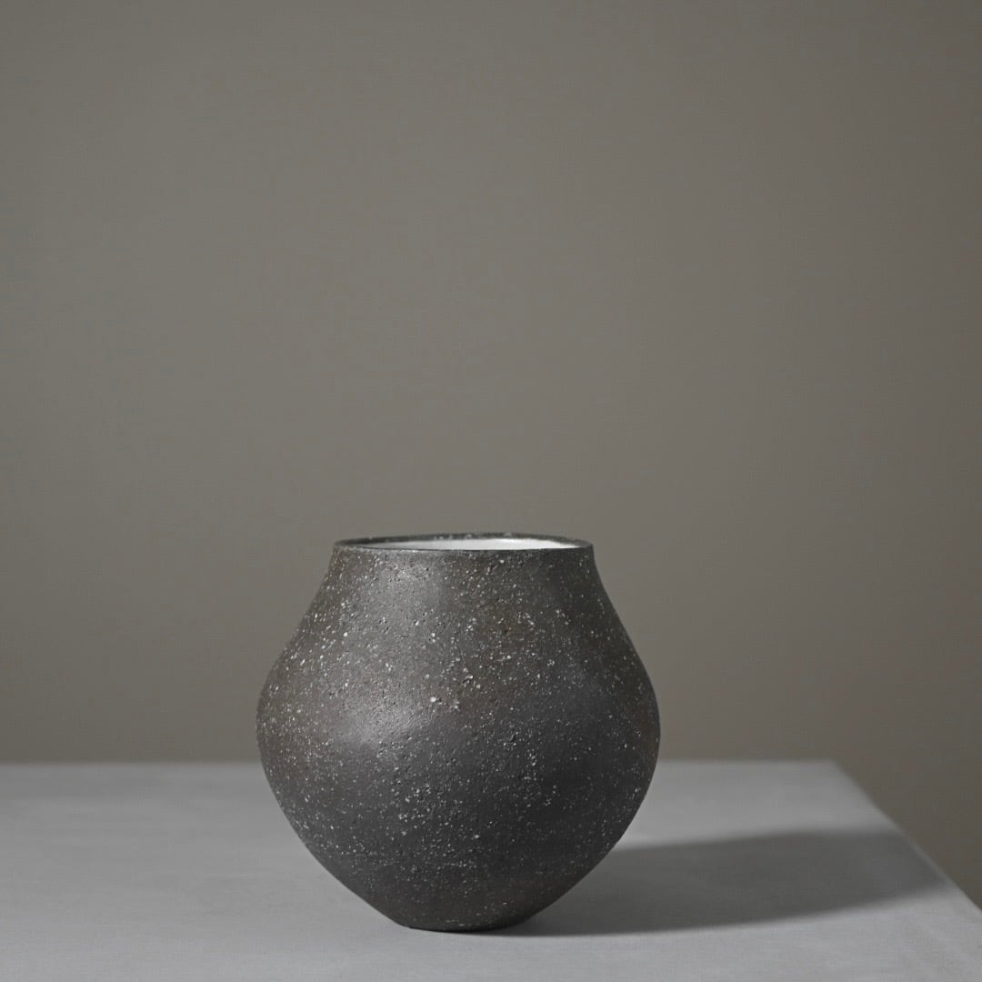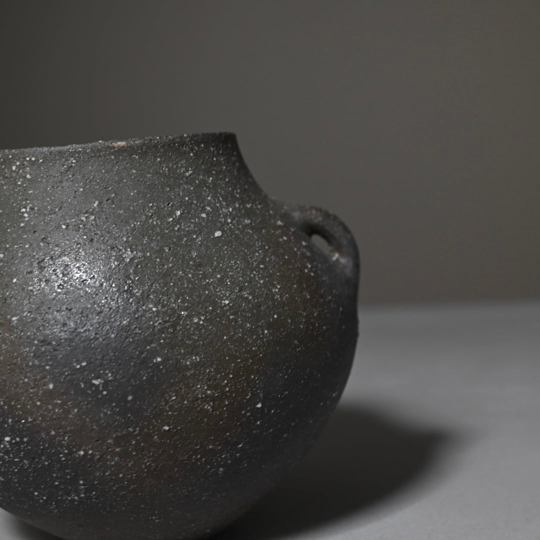 炭化色層とは色味を加えた土を何層か重ねた独自の粉引で作られた作品を、炭と一緒にサヤ鉢と言う鉢に入れて高温で焼き締めています。計算できない表情が形と相まって、独特の魅力となっています。