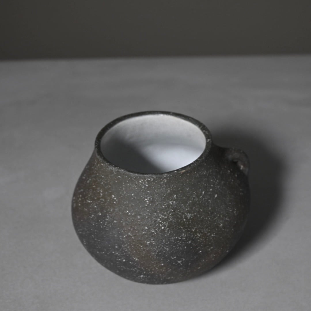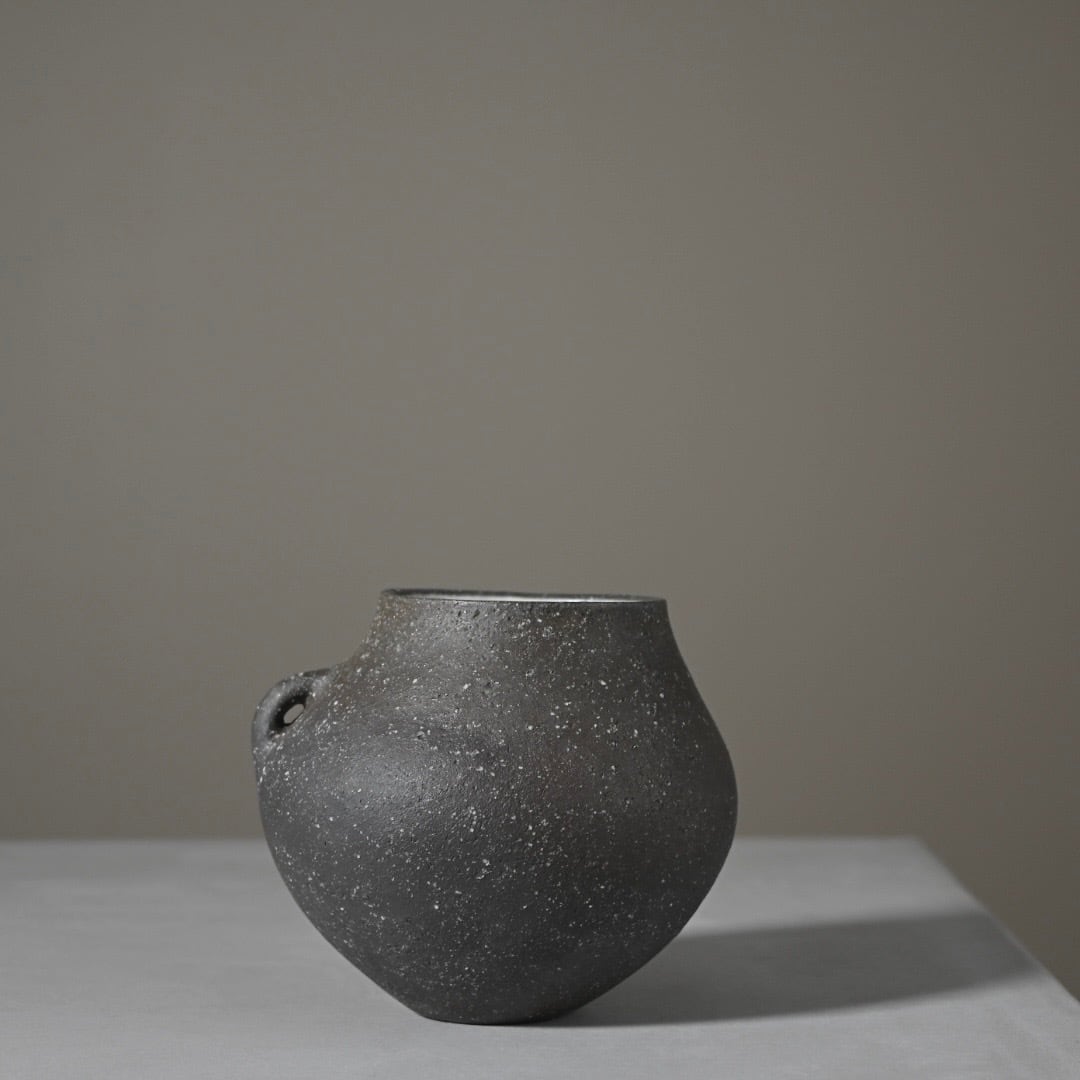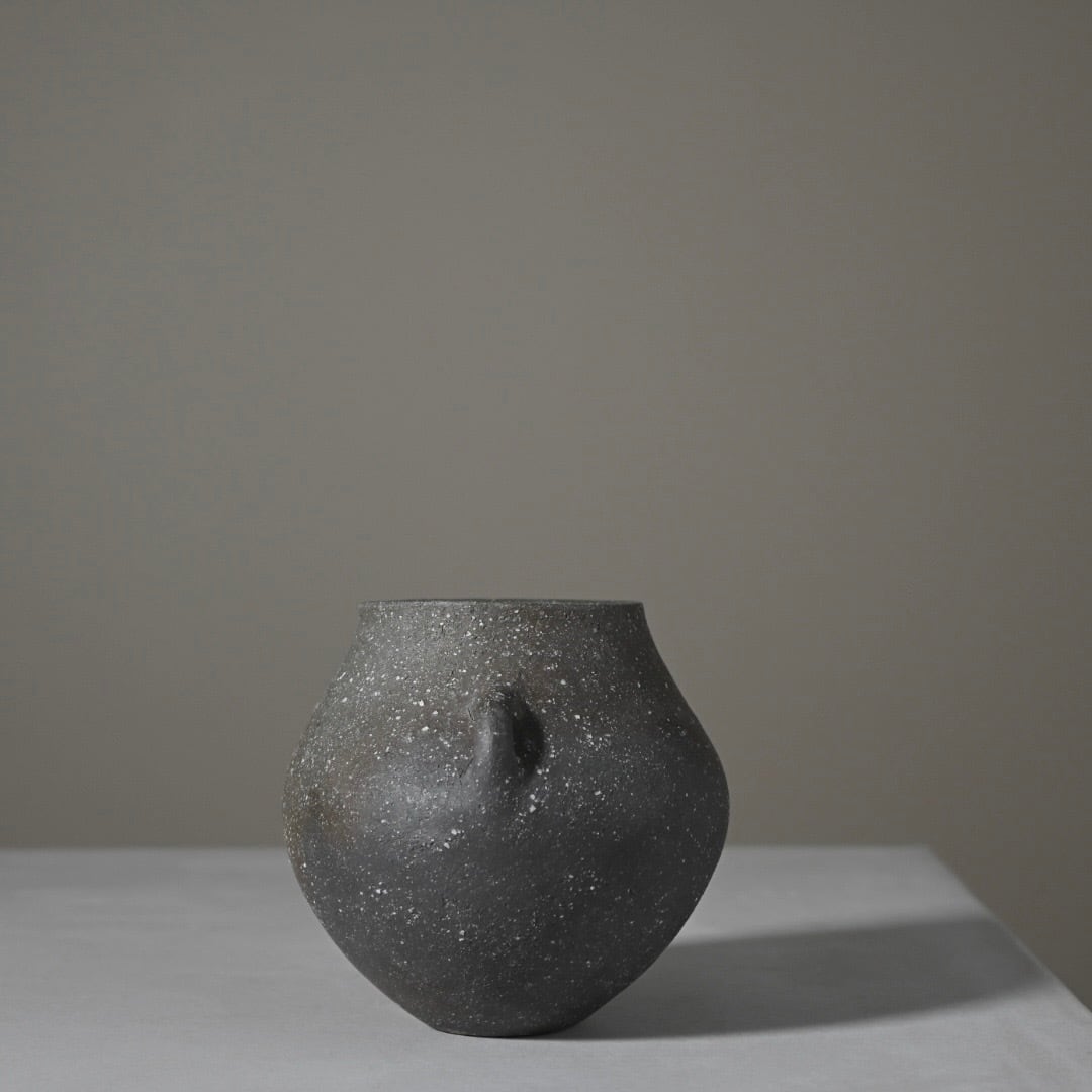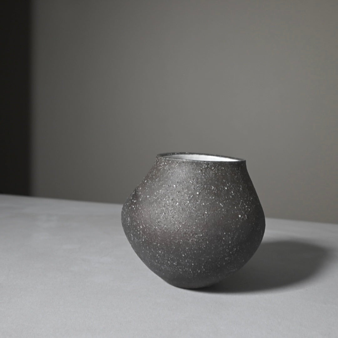 炭化色層とは色味を加えた土を何層か重ねた独自の粉引で作られた作品を、炭と一緒にサヤ鉢と言う鉢に入れて高温で焼き締めています。計算できない表情が形と相まって、独特の魅力となっています。